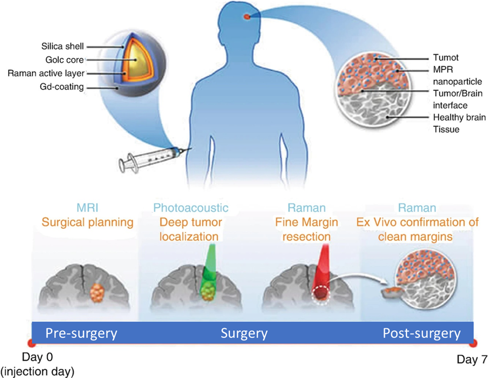 NCI-funded research has produced many notable nanotechnology-based imaging agents over the past decade. For instance, researchers have engineered multimodal nanoparticles that can delineate the margins of brain tumors before and during surgery (Moritz F Kircher, et al., Nature Methods, 2012). These nanoparticles, used in combination of MRI, PAT, and Raman detection, are capable of tracking tumor growth and surgical staging via MRI. These agents also enable the surgeon to visualize a brain tumor down to the single cancer cell level, increasing the potential to precisely remove cancerous tissue (see the figure below). Similarly, scientists have designed silica-hybrid nanoparticles (‘C-dots’). These nanoparticles can be used as contrast agents in PET and optical imaging in the same platform (Evan Philips, et al., Science Trans Med., 2016). They have been proven to actively target metastatic melanoma with cRGDY peptides in clinical trials.