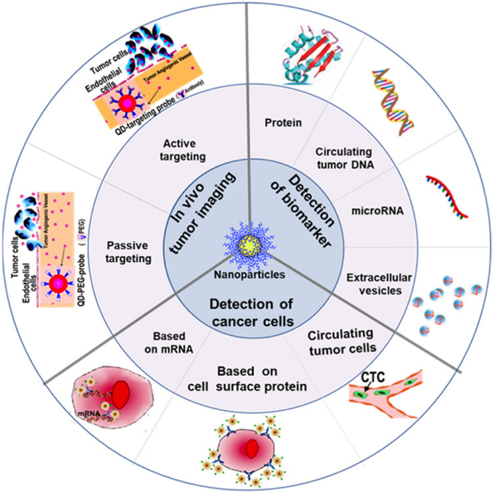 The discovery of cancer-associated molecular alterations has led to new opportunities for early cancer detection. These alterations are found in the blood by employing genomic, epigenomic, transcriptomic, proteomic, and metabolomic assays. Nanotechnology-enabled liquid biopsy diagnostic devices make it possible to enrich for blood-circulating ‘cancer fingerprints’ and then perform omics analyses. Through well-established fabrication techniques, such as lithography, compact devices or point-of-care systems are crafted. These diagnostic tools use biochemical reactions to interrogate the presence, activity, or concentration of specific biological molecules in a bodily fluid sample. These reactions, such as antigen-antibody binding, hybridization of DNA fragments, or ligand adhering to cell surface epitopes, can subsequently be transformed into measurable detection signals using methods like optical, magnetic, or electronic means.